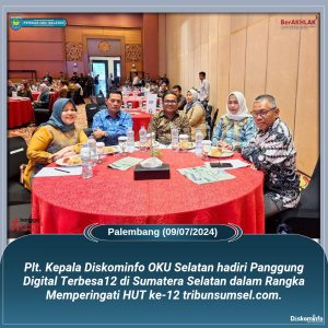 Plt. Kepala Komunikasi dan Informatika Kabupaten OKU Selatan, Zakiah, SE., MM., didampingi Plt Kepala Bidang Komunikasi Publik, Lucy Agusfriani, SE., MM., hadiri Panggung Digital Terbesa12 di Sumatera Selatan dengan tema Inovasi dan Kreativitas dari Bumi Sriwijaya dalam Rangka Memperingati HUT ke-12 tribunsumsel.com. di Ballroom 2 Hotel Aryaduta Palembang, Selasa (09/07/2024).