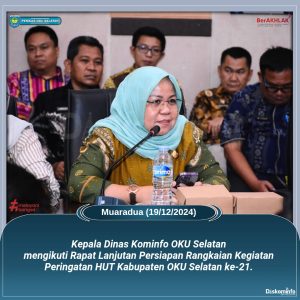 Kepala Dinas Komunikasi dan Informatika Kabupaten Ogan Komering Ulu Selatan (OKUS), Zakiah, SE., MM., mengikuti Rapat Lanjutan Persiapan Rangkaian Kegiatan dalam Rangka Peringatan Hari Jadi Kabupaten OKU Selatan ke-21 Tahun 2025 di Ruang Nagara Bhakti Pemkab OKU Selatan, Kamis (19/12/2024).